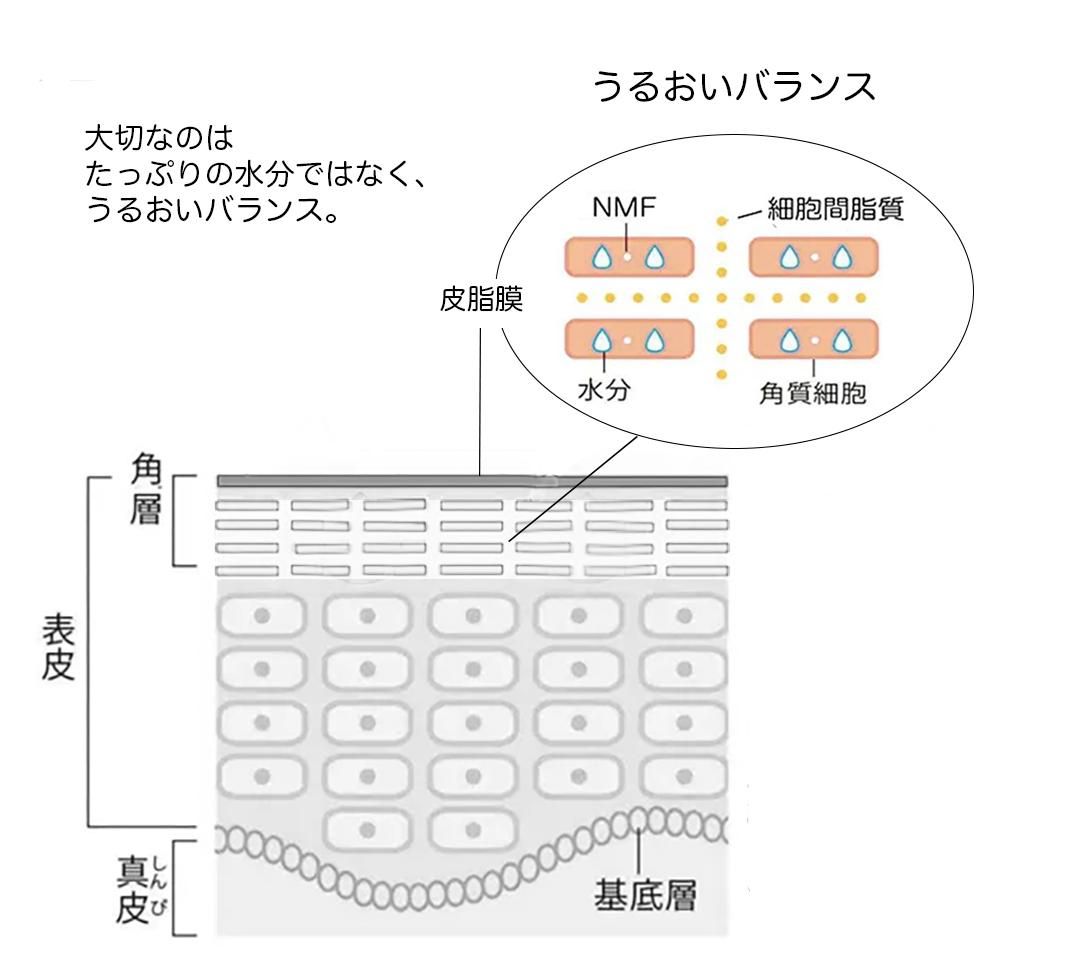 顔の角層の厚さは平均でわずか0.015ミリほど。とても薄くて繊細な層ですが、その中には肌を守る力とうるおいを保つ仕組み(うるおいバランス)がギュッと詰まっています。